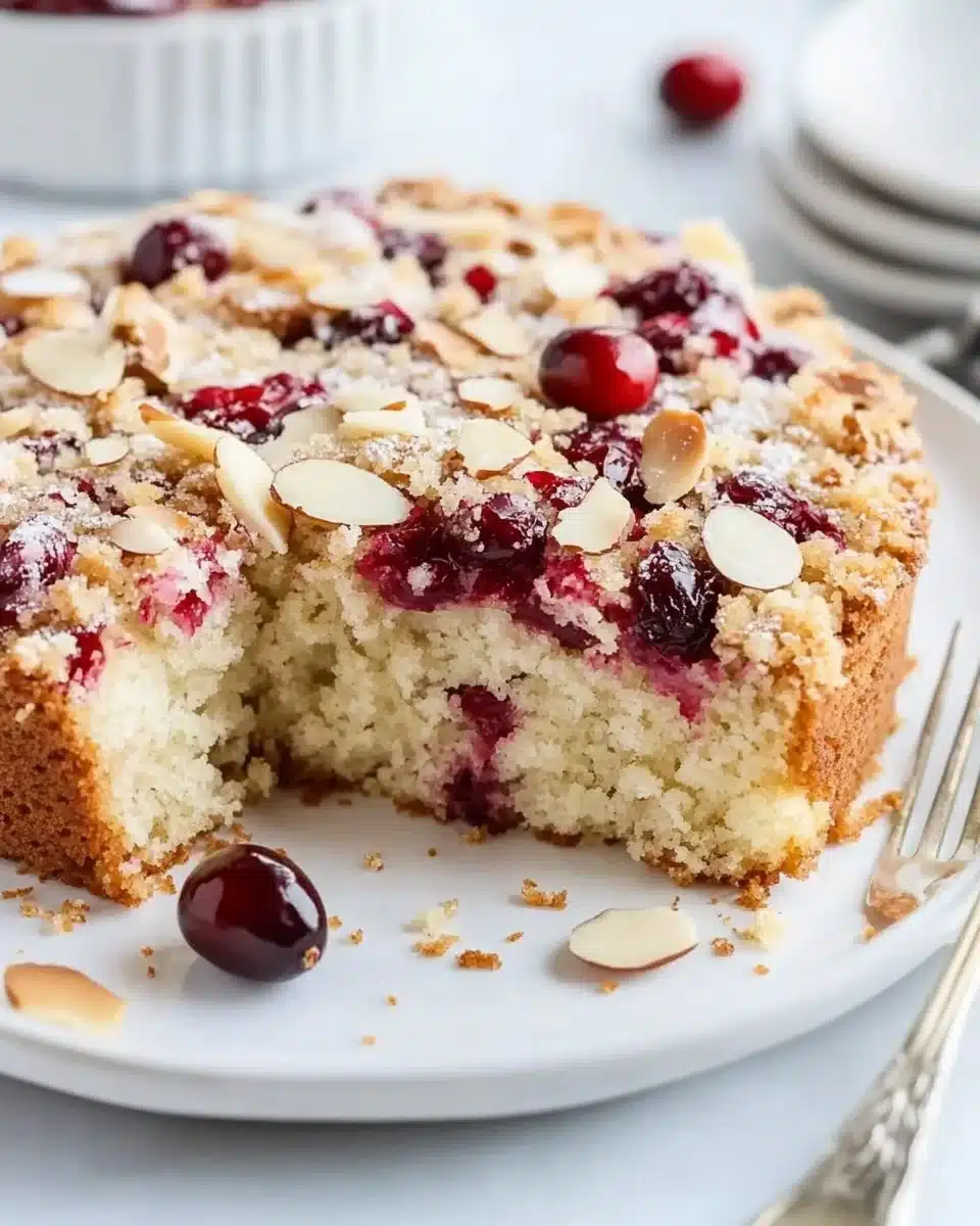 This cake bakes up with a golden top and a soft, pale interior dotted with bright cranberry pockets. You will notice a nutty almond scent while it bakes, and the edges should be lightly browned. A toothpick coming out clean in the center is your best sign that it is done, but a little crumb is fine — we are after moistness, not dryness.
