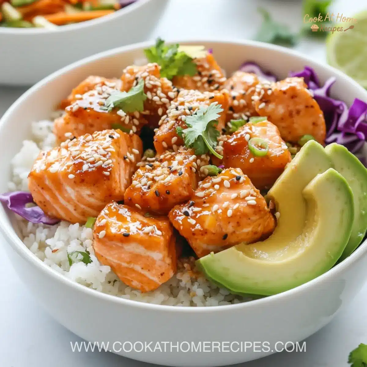 - Spoon jasmine rice into bowls, add cabbage, carrots, avocado, and green onions. Top with warm salmon bites, drizzle with sauce, and finish with cilantro and sesame seeds.