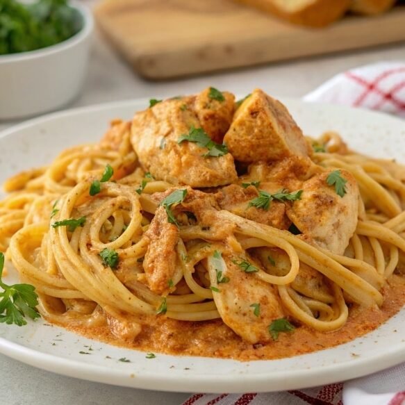 Not only does this recipe deliver on convenience, but it also satisfies on taste. The buttery sauce infused with garlic and spices creates a silky base that complements the chicken and linguine perfectly. Every forkful offers a little spice, a lot of richness, and the kind of flavor that makes it taste like you spent hours in the kitchen.