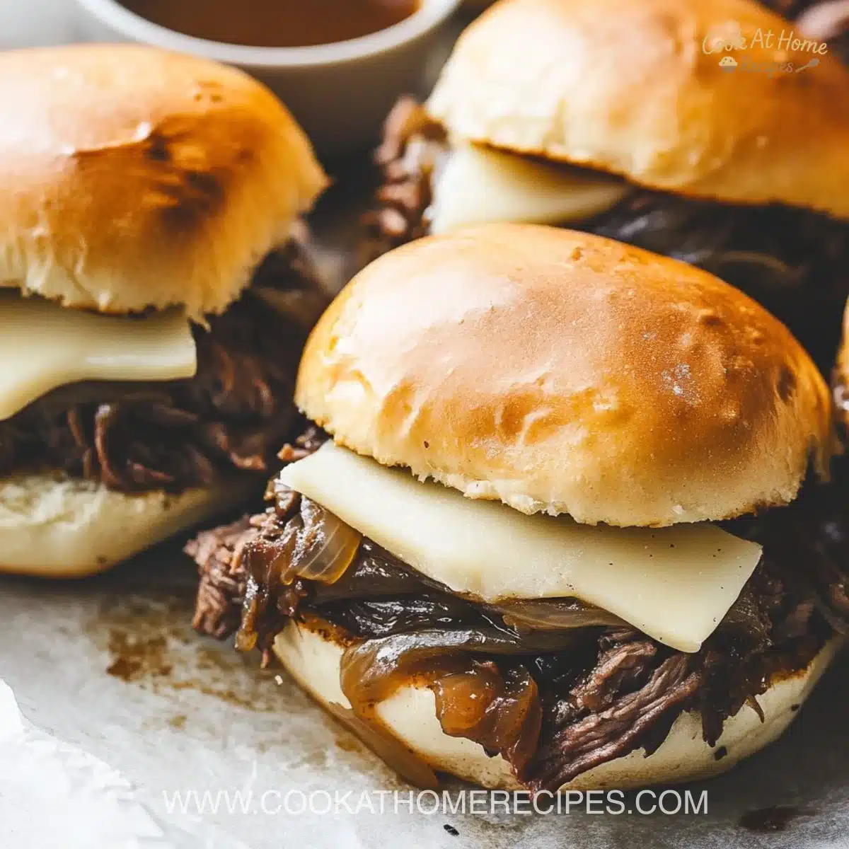 From a practical viewpoint, the recipe is flexible. Use thin-sliced roast beef, or pull leftover deli-style roast into strips. Add a touch of horseradish to the broth for a peppery lift, or skip it for milder tastes. Texture cues tell you you are on track: onions should be glossy and golden, cheese should just melt, and the tops of buns should be lightly browned. These are the signals my grandmother taught me to watch for when she wanted to know dinner was ready.
