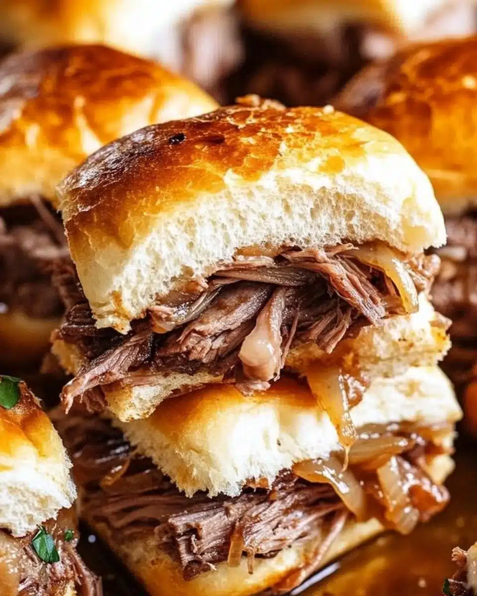 We serve these sliders family-style in the middle of the table. I set out little bowls of warm au jus, a jar of horseradish sauce, and a platter of pickles. Everyone helps themselves, adding sauce or a sprinkle of fresh herbs as they like. It is casual, messy in the best way, and perfect for conversations filled with small interruptions.