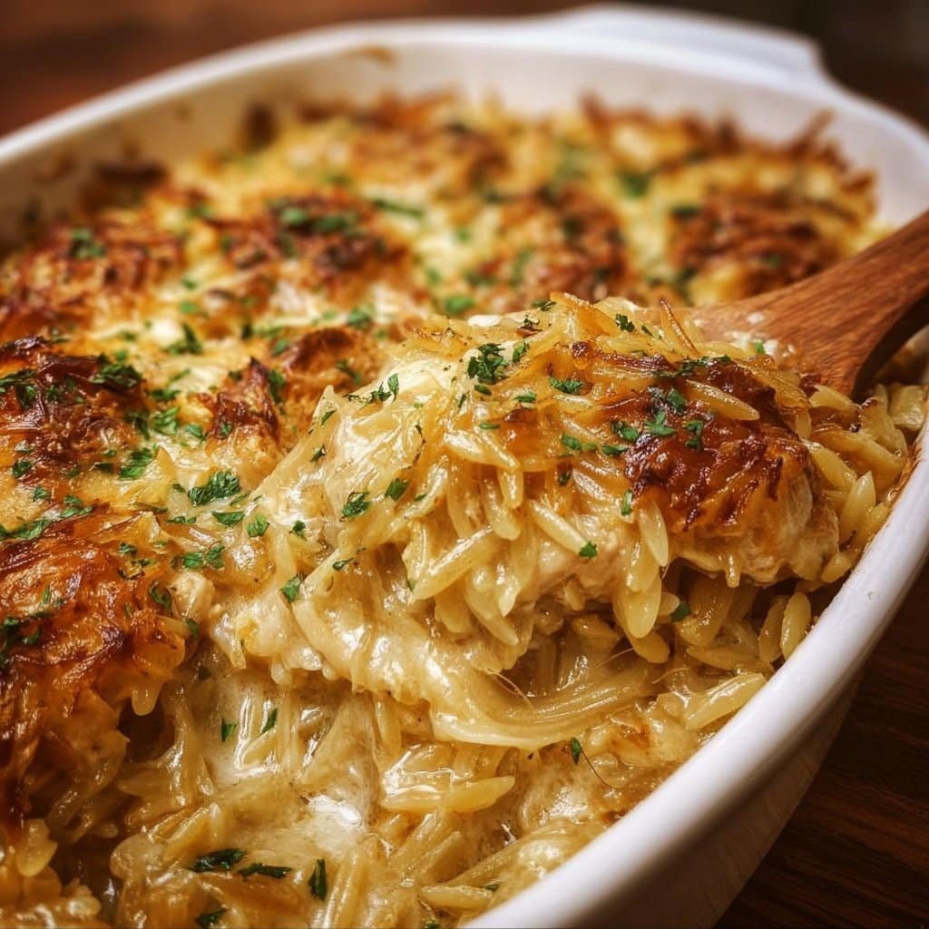 A comforting casserole that combines caramelized onions, tender chicken, and creamy orzo pasta, topped with cheese and baked to perfection.