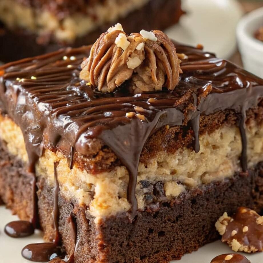 Slice the German Chocolate Poke Cake into squares and serve it on plates. It pairs well with a scoop of vanilla ice cream or a dollop of whipped cream. This cake is great for sharing at parties or enjoying with family after dinner.