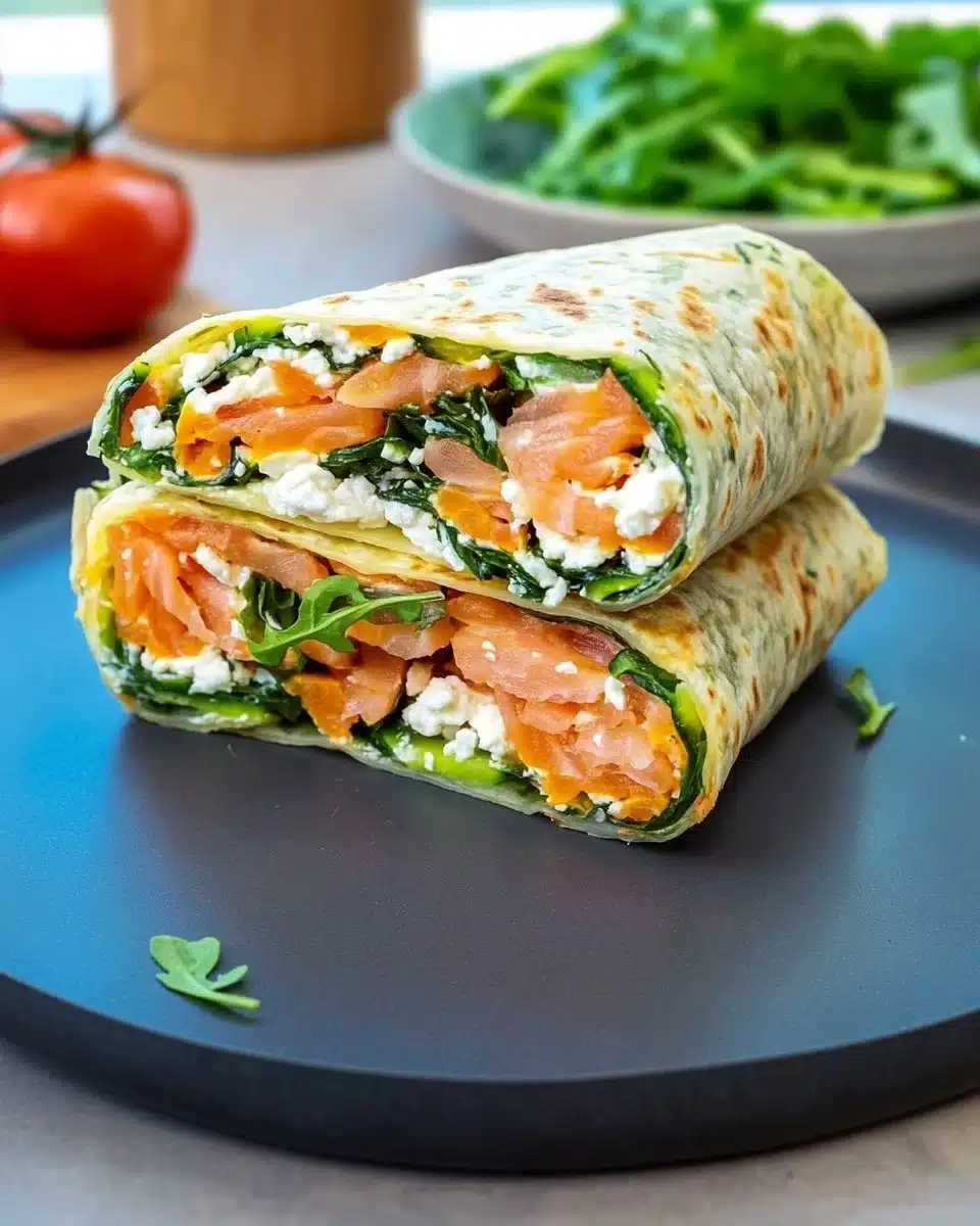 6. To assemble, spread a thin layer of cottage cheese on each wrap, top with arugula, smoked salmon, thinly sliced onions, and tomato. Fold or roll and press lightly to seal.