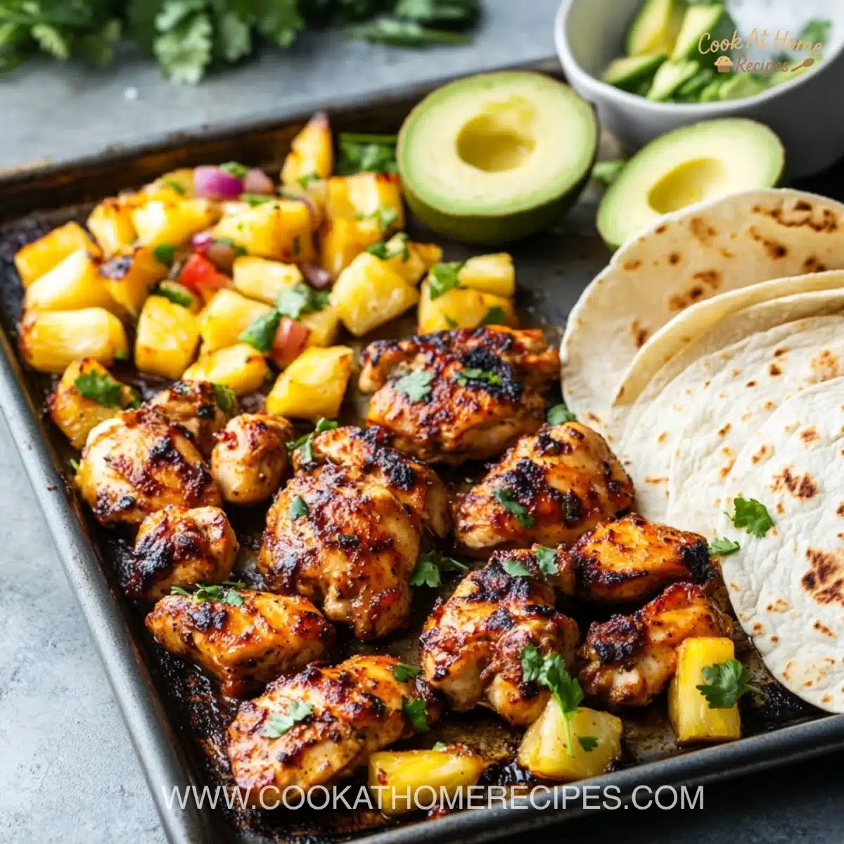 1. Serve chicken and pineapple family-style with tortillas, avocado, and other toppings on the side.