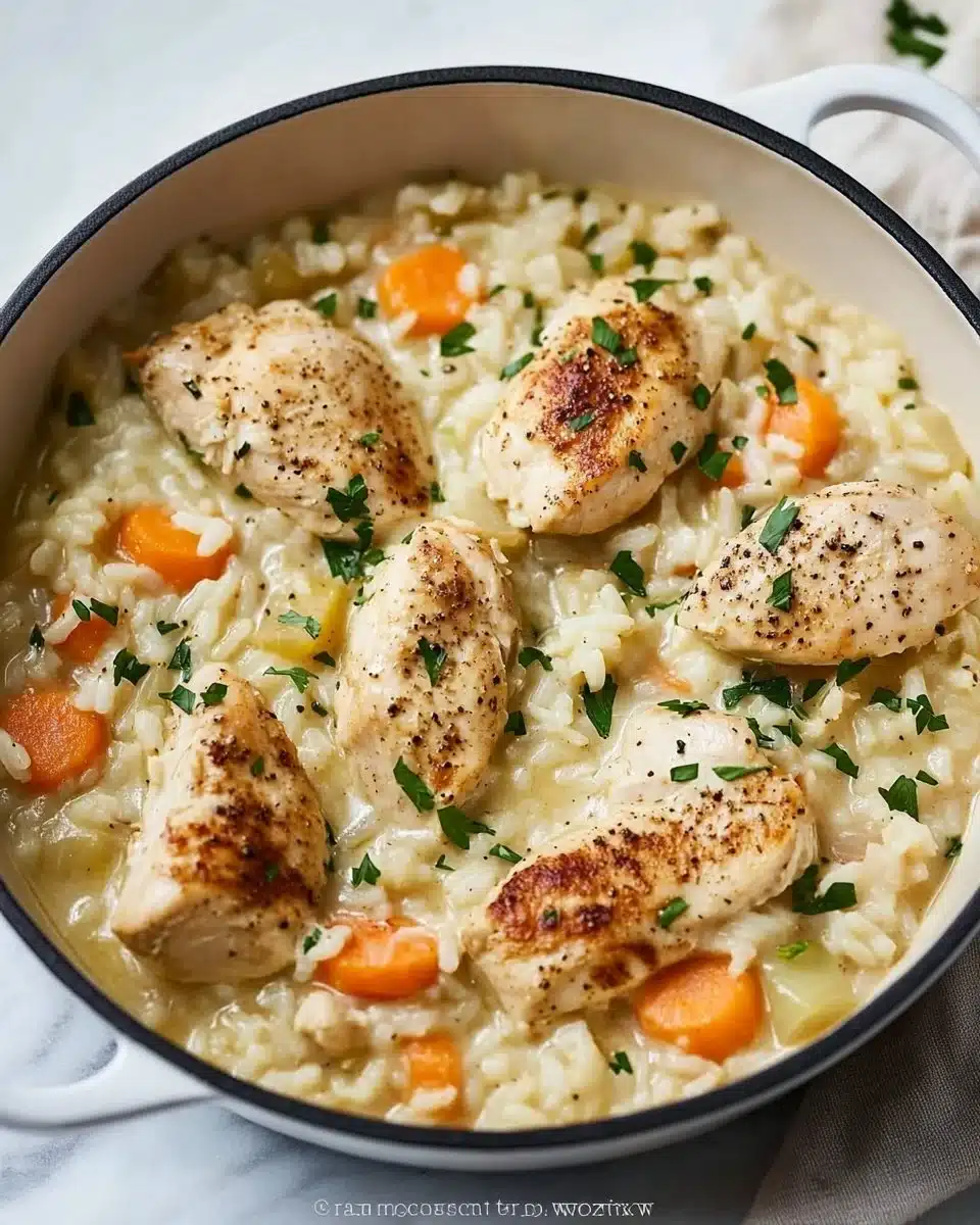 Look for visual cues. The chicken will have a light golden brown on the edges when it is ready to welcome the vegetables. The rice will be slightly translucent and swollen, not crunchy. Once you stir in the milk and parsley, the dish goes from warm and homey to bright and creamy in minutes. If you are curious about other one-pot spins, this is a great place to begin before you try variations like a cheesy finish or a different grain.