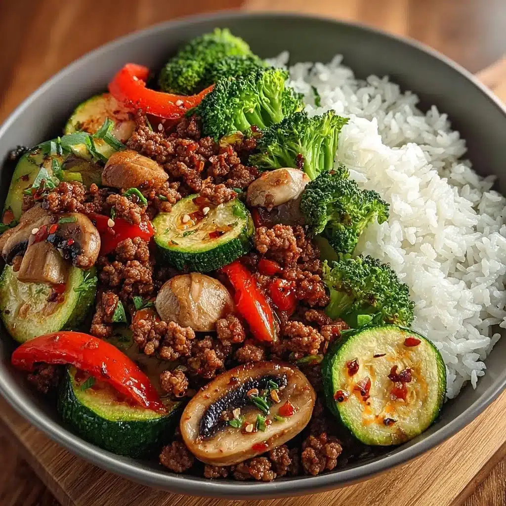 The Simple Magic Behind Spicy Ground Beef Stir-Fry Bowl with Garlic Veggies & Steamy Rice